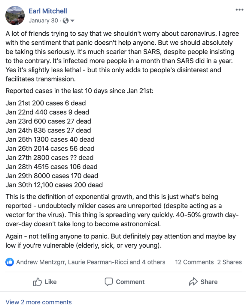 The best and most relevant example of this is the current COVID-19 outbreak. I’ll be doing an entire series diving deep into this pandemic (yeah, I said it) over the next few weeks. I’ve been following COVID-19 for months. Here is a facebook post I put out to give friends and family a warning about COVID-19 before it even had a name: