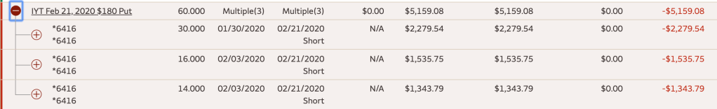 My 60 puts all expired worthless on Feb 21 with the IYT at $195. So much for insight turning into profit. Over the next 15 trading days IYT would fall over $30 to where it sits now at $161, with more downside undoubtedly on the way. Those 60 puts, taken out at a more distant strike, would have been marginally more expensive to buy, but would now be worth over $120,000. So when I say I was early… I was really early.